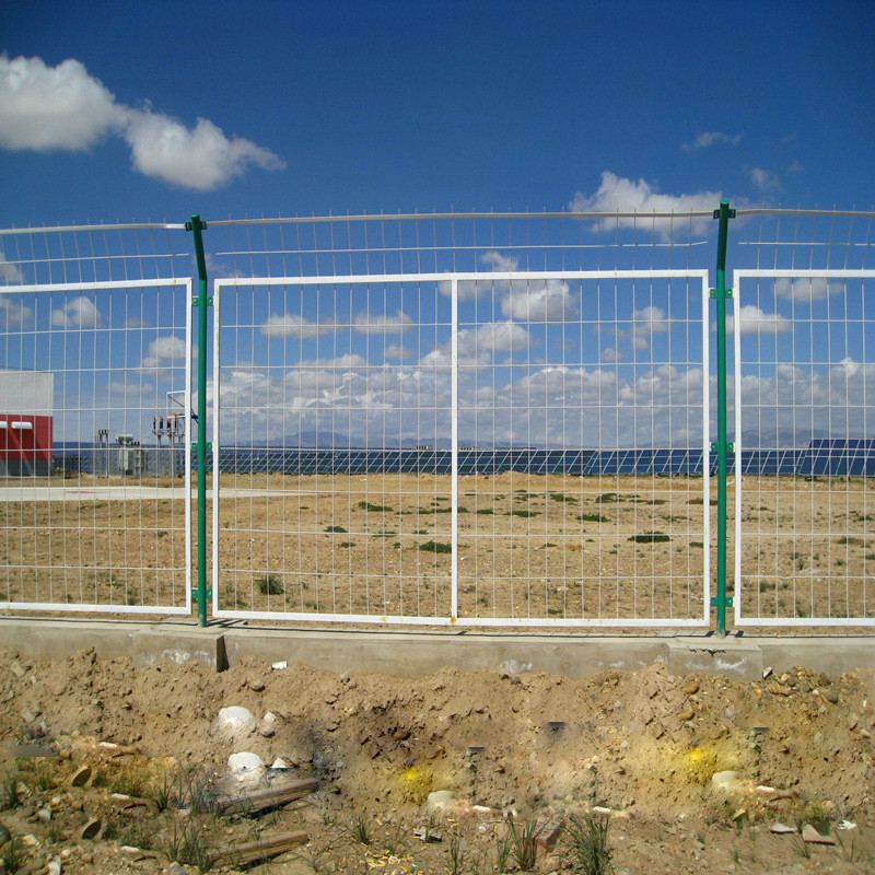 太陽(yáng)光發(fā)電站圍欄采用采用低碳鋼絲作為原材料,表面浸塑具有日久抗腐蝕、抗紫外線(xiàn)不怕雨淋的特點(diǎn)。這種工藝有無(wú)需模具、加工成本低、成型容易、可加工各種外形等特點(diǎn)被廣范使用。是專(zhuān)門(mén)為光伏電站設(shè)計(jì)的防護(hù)設(shè)備,主要是用在光伏電站各個(gè)區(qū)域的防護(hù)和隔離.它有效防止了變電站內(nèi)外的人身安全和變電器等設(shè)備的防盜,是光伏電站重要的防護(hù)產(chǎn)品。