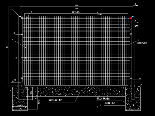 鋼筋網(wǎng)圍欄網(wǎng)面是由直徑5mm的鋼筋排列成矩形網(wǎng)格點(diǎn)焊形成,相鄰橫筋間距不大于10cm,相鄰豎筋間距不大于5cm.每片鋼筋網(wǎng)片寬度不大于3m,用螺栓固定在事先埋設(shè)好的立柱上.為增加圍界的穩(wěn)定性,一般每30m左右增加一個(gè)斜撐.圍界上部50—60cm以30.一45.角向外傾斜,或設(shè)置滾筒形刺鐵絲網(wǎng)防止攀越。