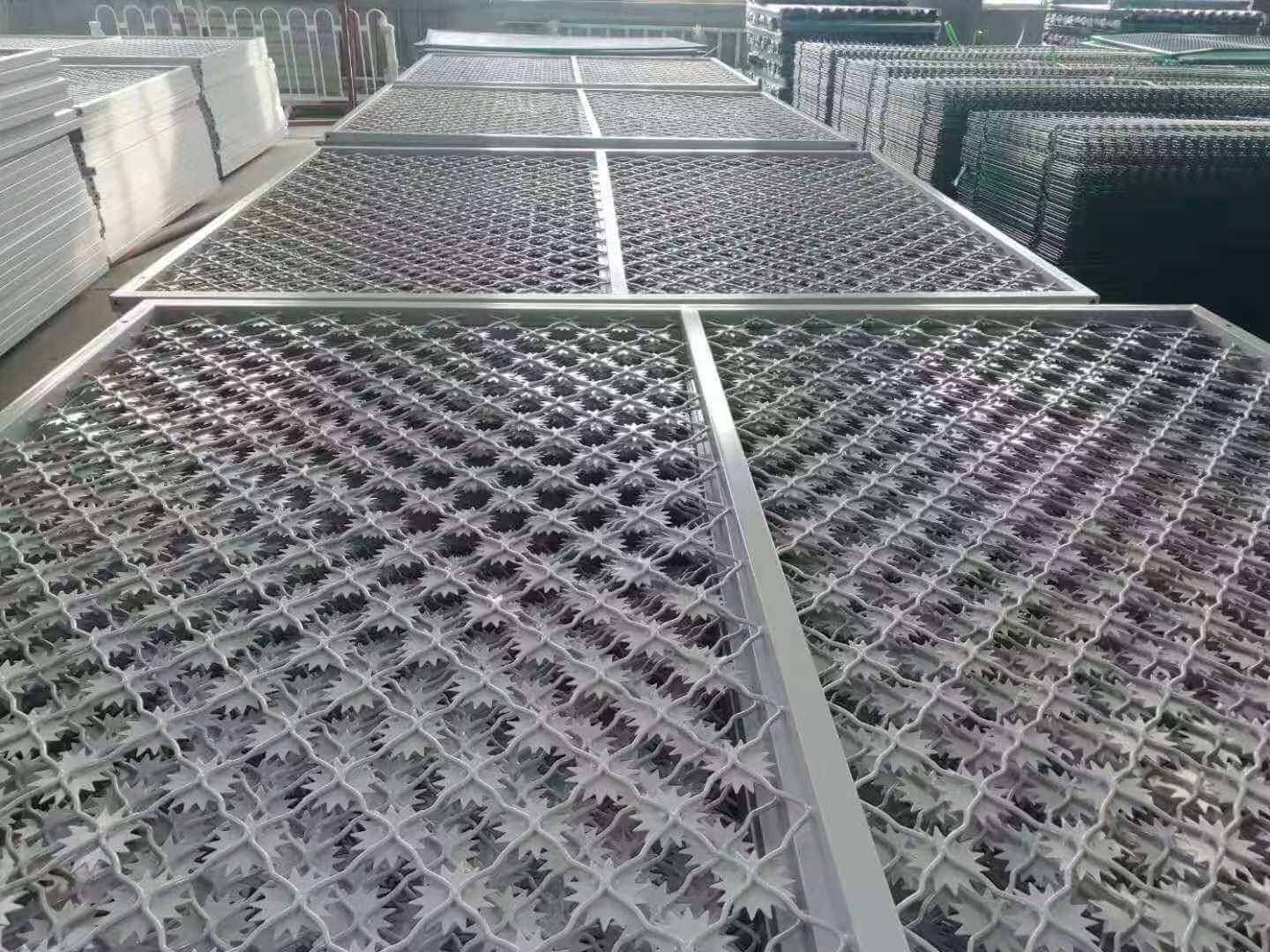 太陽(yáng)花刺片直徑不小于7.5cm,刺片厚2.0mm、采用Q235低碳鋼板沖壓成型。太陽(yáng)花刺片監(jiān)獄護(hù)欄網(wǎng)網(wǎng)片為菱形網(wǎng)孔,網(wǎng)格尺寸:100*100mm。